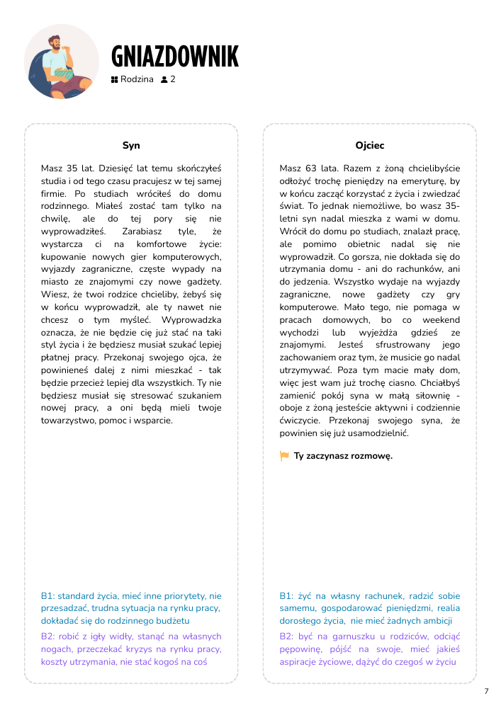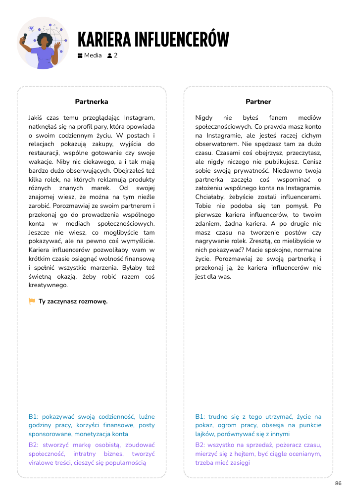 Wejdź w rolę! to zestaw gotowych scenariuszy scenek opartych na technice role-play. Materiał jest przeznaczony dla uczniów na poziomach B1–B2, ale sprawdzi się także w bardziej zróżnicowanych grupach.